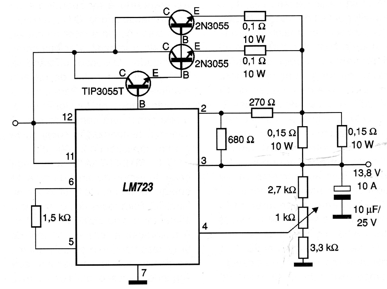 It is a 13.8 V x 10 A regulator obtained in a 2008 documentation. The 2N3055 transistors must be mounted in excellent heat sinks and the voltage is adjusted in the trimpot.