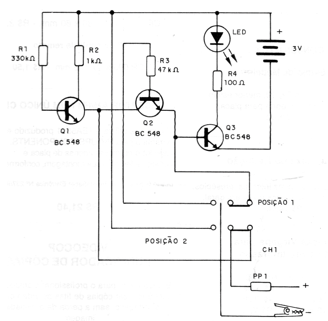 This sensitive multi-circuit and component prover uses two transistors and has a switch position where the input resistance is increased, which can be interesting in testing high-resistance circuits and components. In this condition of greater resistance, small value capacitors can be tested when the LED flashes the test.