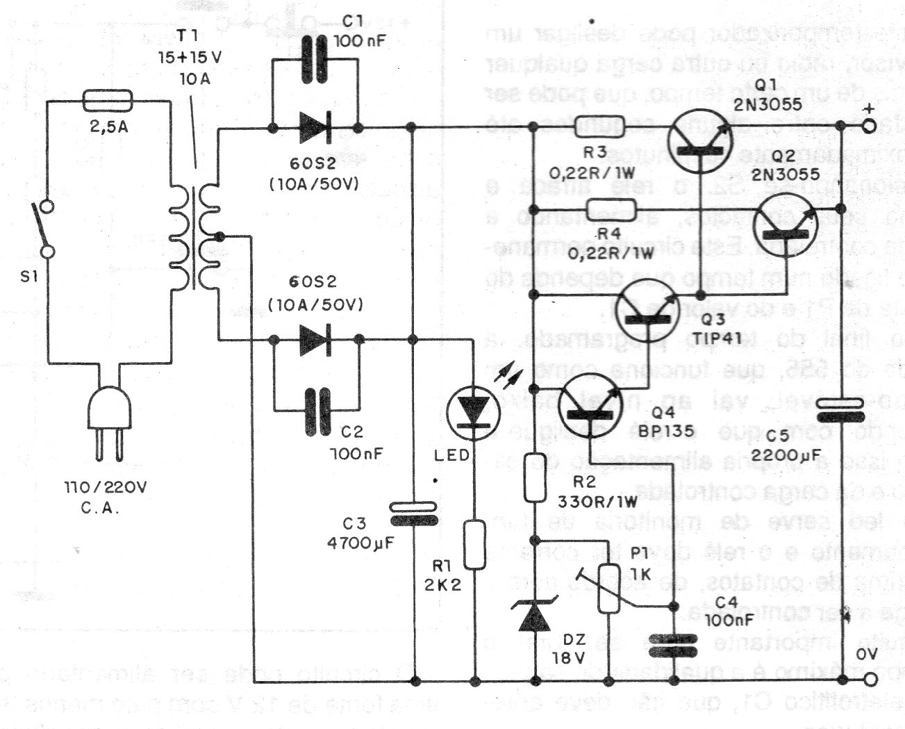 This transistor source was found in a 1990 documentation. 2N3055 transistors must be equipped with large heatsinks and for the BD135 a small heatsink will be sufficient. The source is adjusted by a potentiometer and it has no protection against shorts at the output.