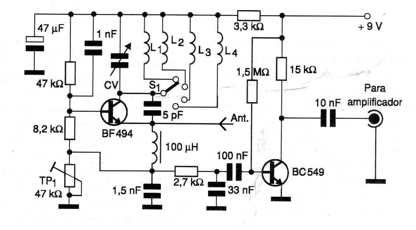 This simple super-regenerative receiver has 4 tuning bands given by the coils. L1 has 8 turns of wire 18 in the form of 1 cm without core. L2 has 5 turns, L3 has 4 turns and L4 has 2 turns. The wires from the selector switch to the circuit must be very short.