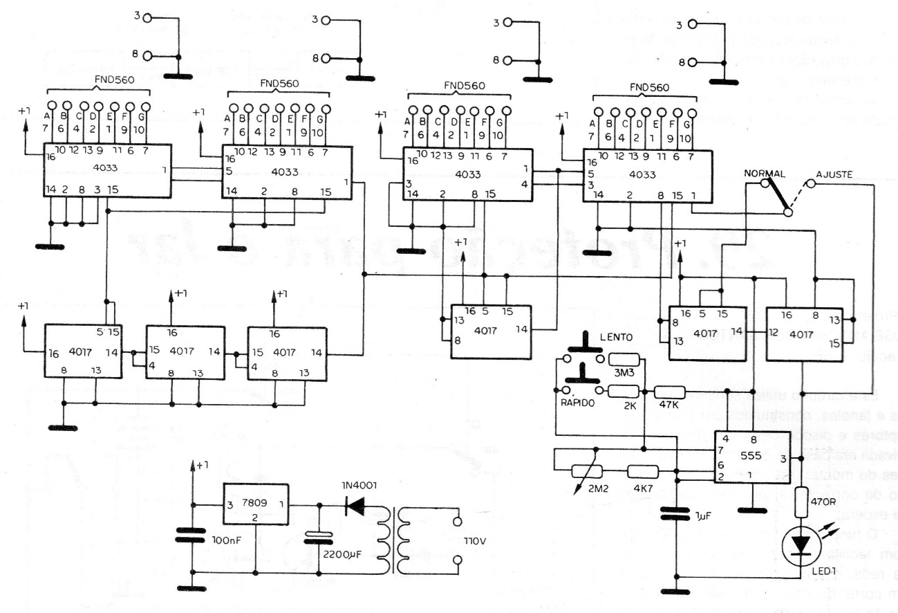 This circuit is from a 1979 publication, using displays of 7 segments of common cathode. The circuit has its precision dependent on the setting of the 555, which should produce a pulse per second. The integrated circuits are CMOS.