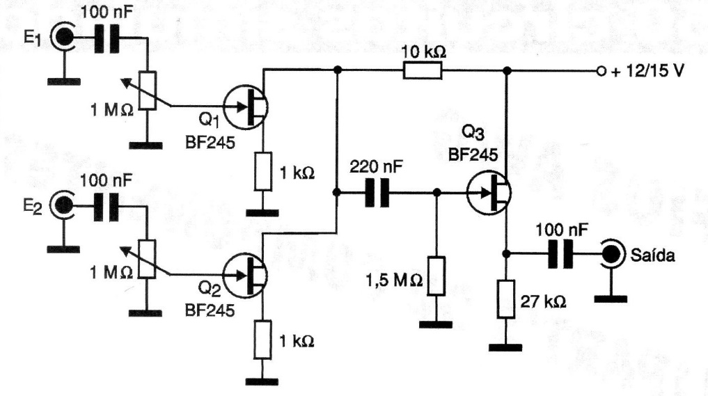 This second mixer version is an improvement on CIR10339 using independent FETs for the inputs. The number of inputs can be increased, and the impedance is very high. Signal input and output cables must be shielded. The drained current is very low.