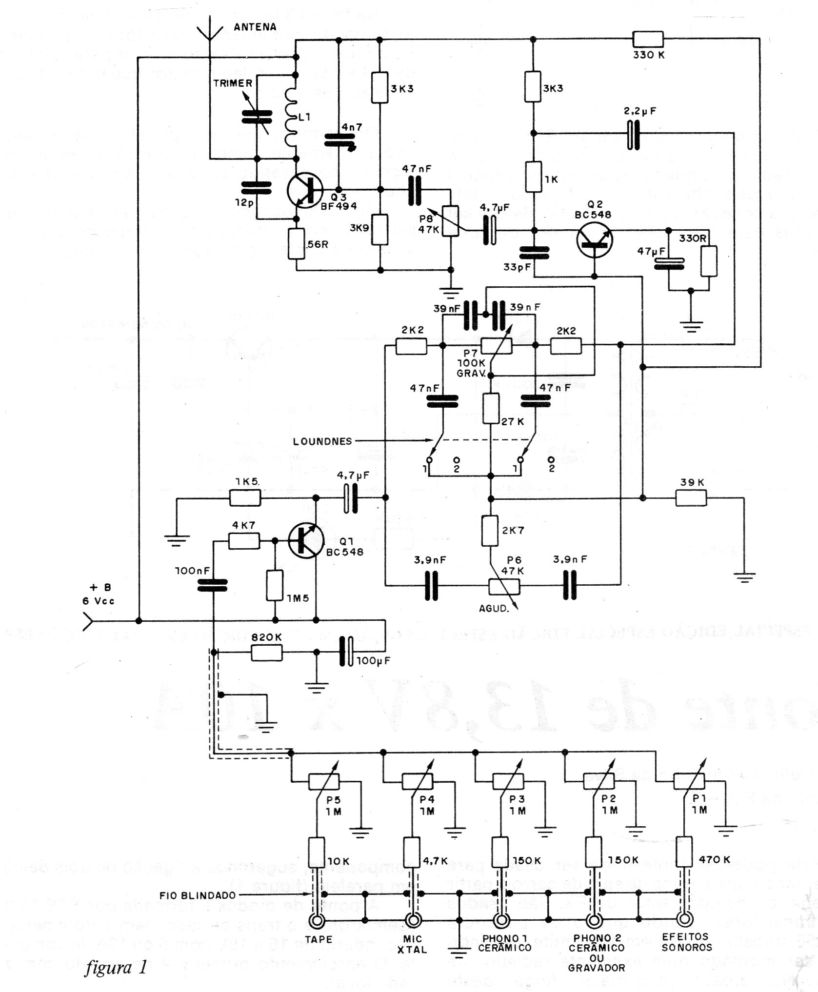 This low power circuit was found in a 1986 documentation. It includes tone controls, mixer, and good gain preamp. The coil has 4 turns of wire 22 to 26 in the form of 1 cm without core. The supply is made with 6 to 9 V of source with excellent filtration.