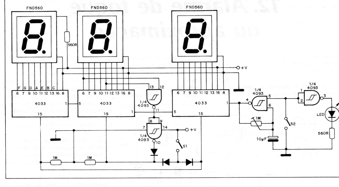 This circuit obtained in a 1989 documentation can be useful for photographers in determining exposure or shooting times, as appropriate. The circuit uses common cathode displays and the adjustment of the count is done by a trimpot.