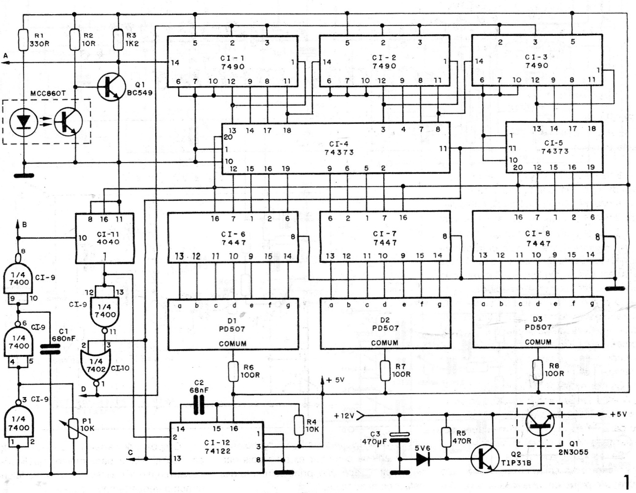 This circuit, found in a 1986 documentation, uses an optical sensor to count pulses and, in its function, show speed on a 3-digit display. The displays are of common cathode and the technology used is TTL which requires a 5 V supply. The circuit has a counter that allows adaptation to vehicles that already have a common speedometer. The power transistor of the source must have a heat sink.