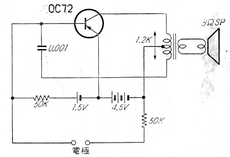 This conventional Hartley oscillator circuit with an audio output transformer was found in a Japanese magazine from the 1960s. In fact, any general purpose PNP can be used and the supply is made with voltages from 3 to 9 V without problems. The transformer is an output transformer of the type found on old transistor radios.