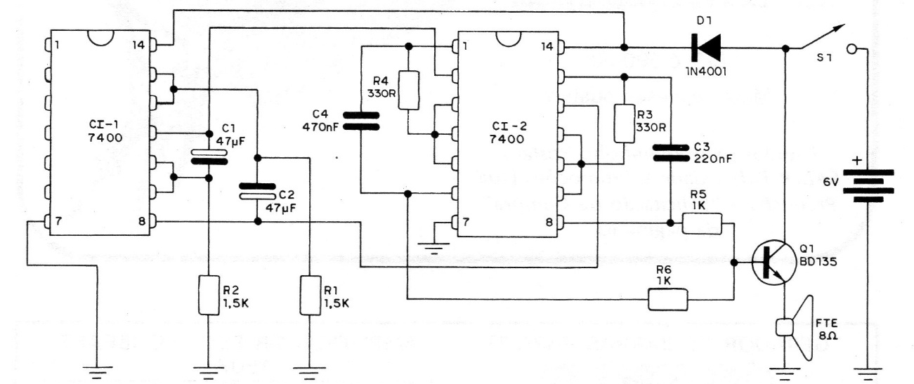 Because it uses TTL integrated circuits, this siren must be powered by 5 V or as indicated with D1 to reduce the voltage. The circuit can be used as a shield, simply releasing pin 9 of the CI-1 and using it as a digital control of the microcontroller. The power stage with the BD135 can be powered by a higher voltage.