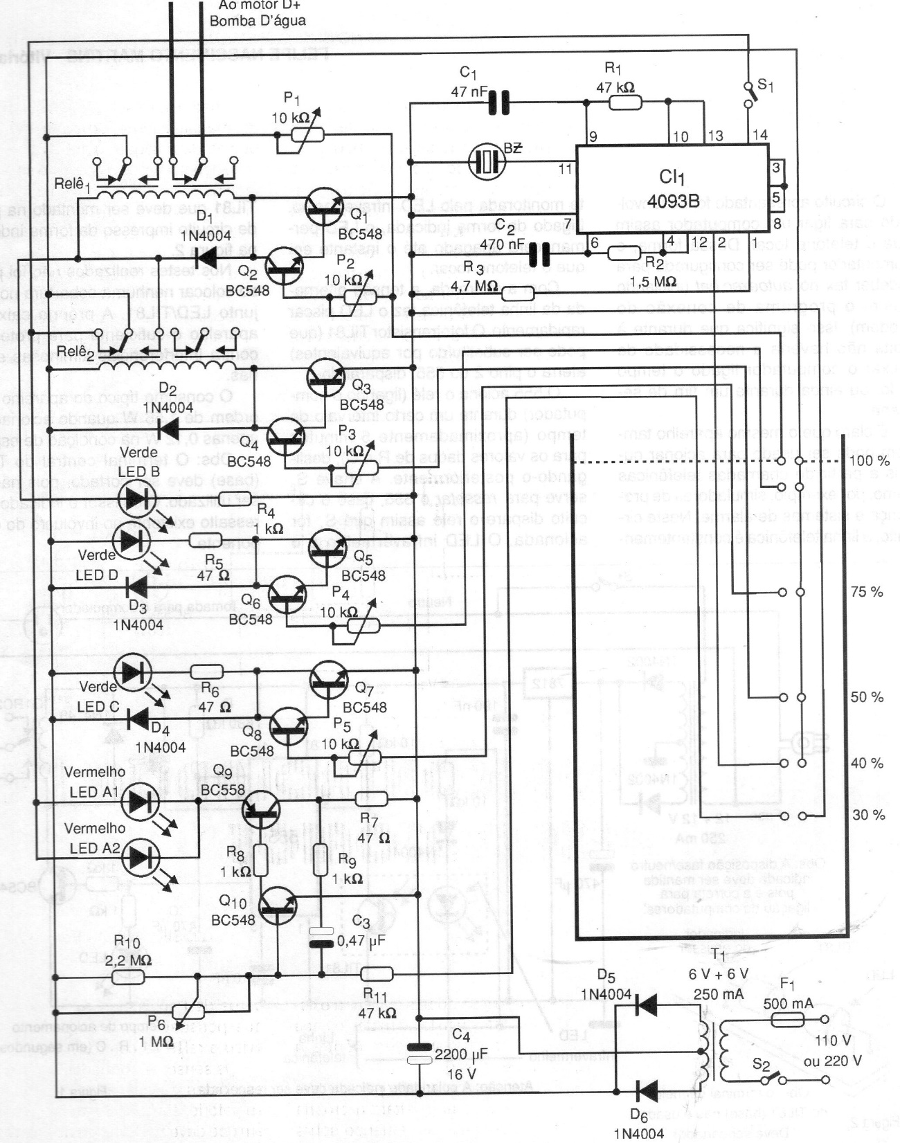 The sensors in this circuit, found in a 1999 documentation, are stripped wire tips at different levels of control. The circuit uses LED monitors on a multi-point scale. At the minimum level, the circuit activates a relay that controls a pump by turning it off at the maximum level.