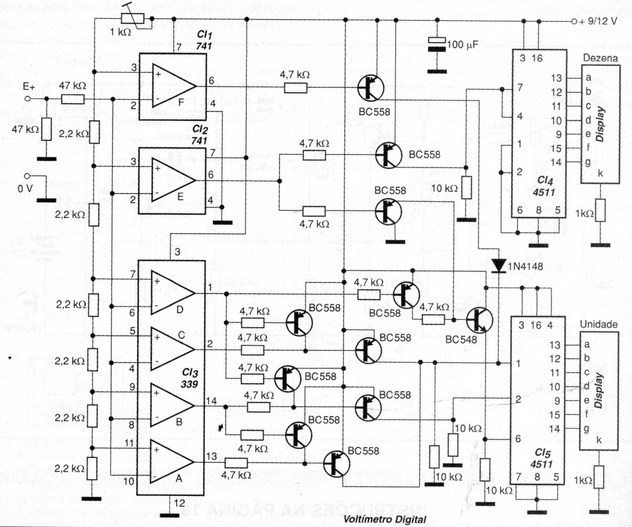 We present a circuit formed by six voltage comparators. Each comparator will analyze the voltage difference at every 2 V of the reference point, thus composing a total 12 V ladder that will be presented through the displays. For every 2 V applied to the input (E +), the corresponding value range 2 - 4 - 6 - 6 - 8 - 10 - 12 will appear on the display. The tens digit will be off until the value 8 and will light up when the input voltage exceeds 10 V, then the number 1 appears together with the number of the units. The circuit can be supplied with voltages of 9 or 12 V, which leads to the possibility of using a battery for portable operation. The circuit is not very accurate, as it depends on the values of the components used. To adjust the circuit, connect a variable voltage source to the input (E +) and adjust the 1 k trimpot so that for each 2 V of input the corresponding value appears on the display in the scale of 2 and 2.