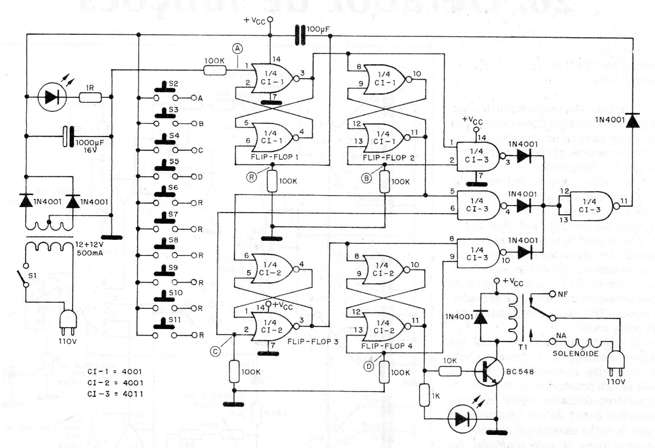 This encrypted key was found in a 1989 documentation. It controls a relay that is activated only when the programmed sequence is entered. The power comes from a 12 V source, which is the voltage used by the relay. The circuit is based on common CMOS integrated circuits today.