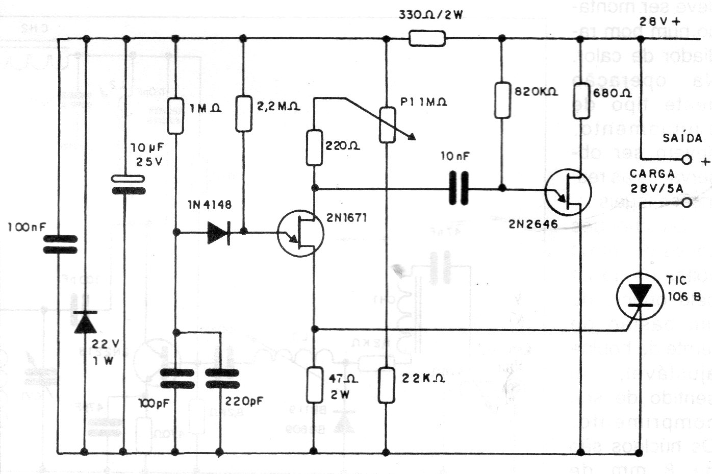 This simple timer based on unijunction and SCR transistors is from 1995 documentation. The maximum timing depends on the electrolytic capacitors and the adjustment made in a trimpot. The circuit can directly trigger a direct current load. The supply must be made with voltage between 24 and 28 V.