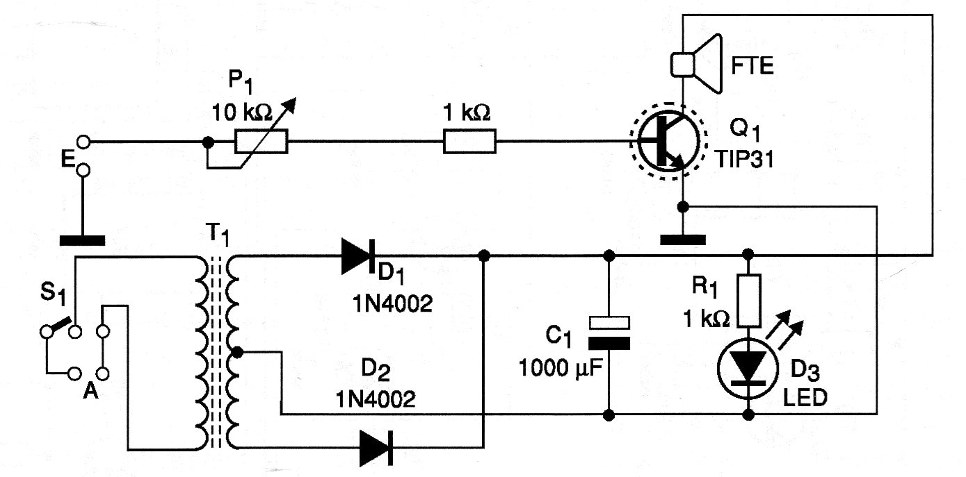 This circuit reinforces the radio signal and small sound equipment powered by batteries. The transformer has a 6 + 6 V secondary with 500 mA and the power transistor must have a small heat sink. P1 adjusts the excitation of the circuit for better sound quality.