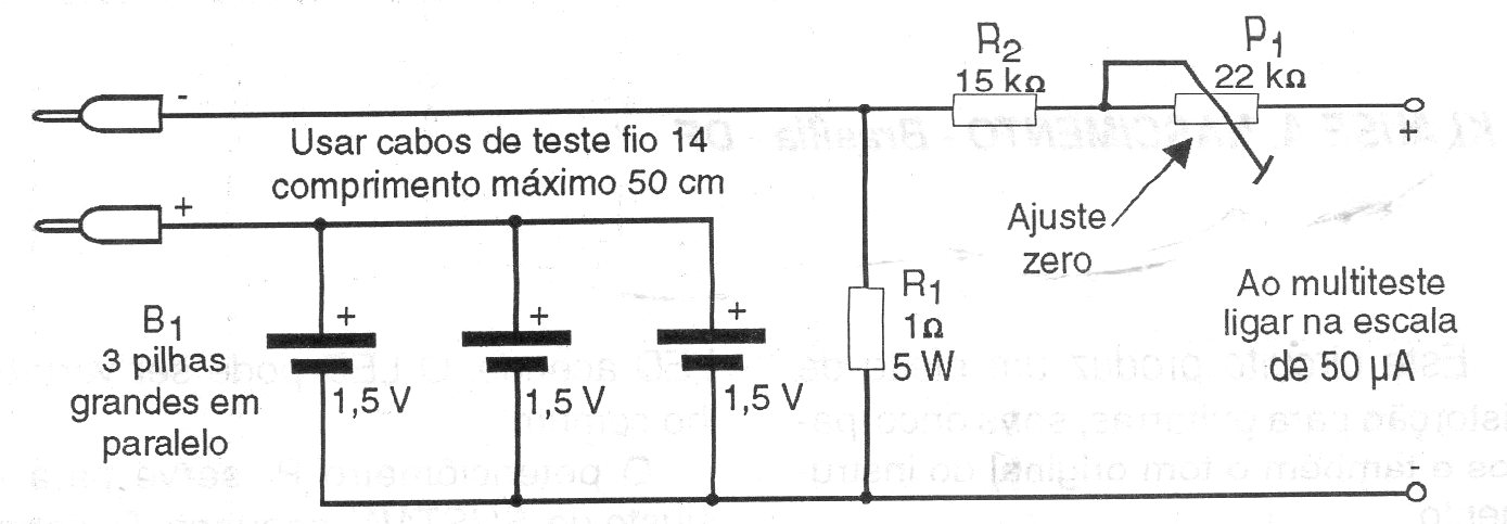 The purpose of this circuit is to measure very low resistances, using the lowest current range of an analog multimeter. The circuit is from 1997 and uses a little recommended configuration which is the parallel connection of batteries. In this circuit, a reading of 15 uA is equivalent to 1.5 ohm.
