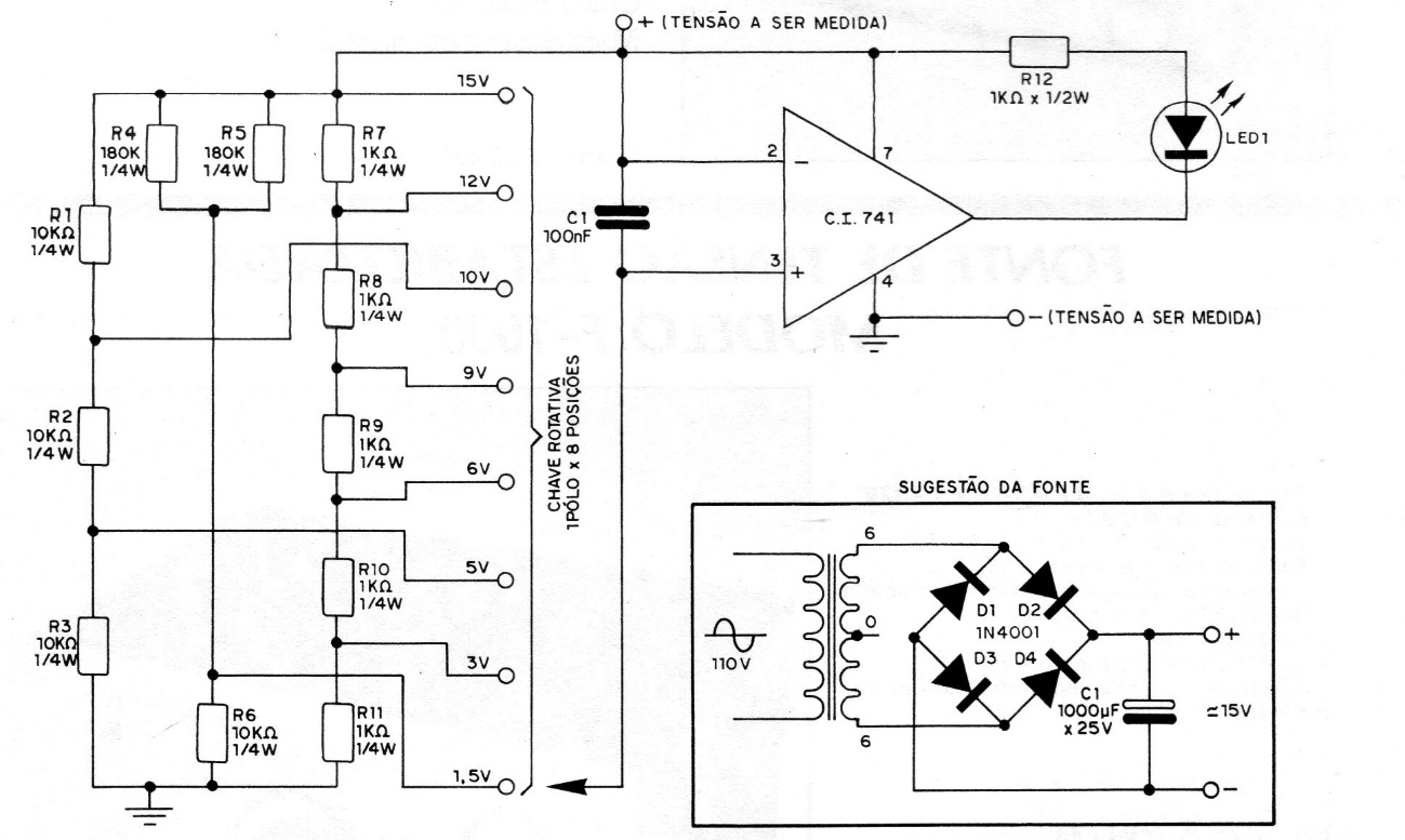 This circuit for the 1.5 to 15 V scaled ranges was found in a 1982 documentation, but uses current components, being also given the power supply. With changes, it can be used as an input shield or even monitoring for triggers. In the original publication there is a connection between the input and power of the CI. She does not exist. The CI must be supplied with 15 V from the indicated source.