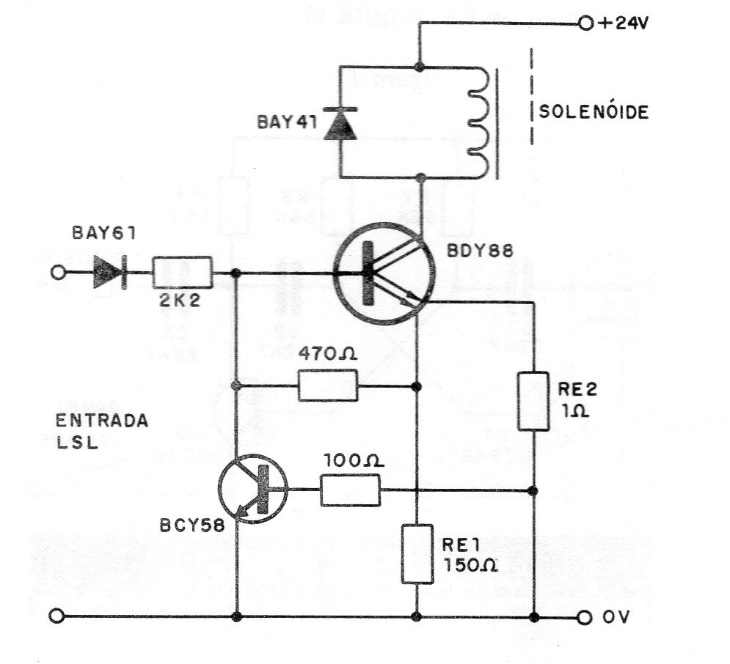 This circuit uses a Darlington transistor and was found in a 1986 documentation. The circuit controls a current of up to 1 A with 24 V supply. The solenoid must have a resistance of 56 ohms and a reactance of 56 mH.