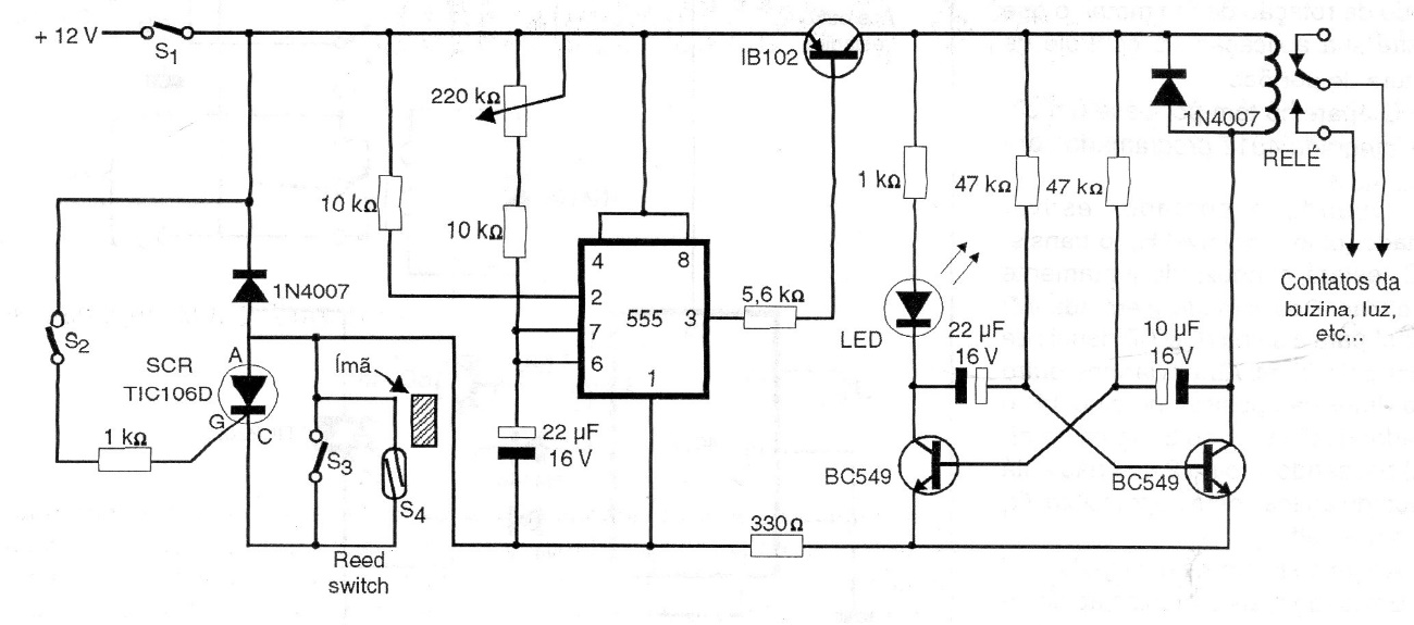 This circuit, which uses components still common today, was found in a 1997 documentation. It activates an intermittent relay for a certain time, adjusted in the 220k pot. The sensors are connected in series of type NA and the supply is made with 12 V.