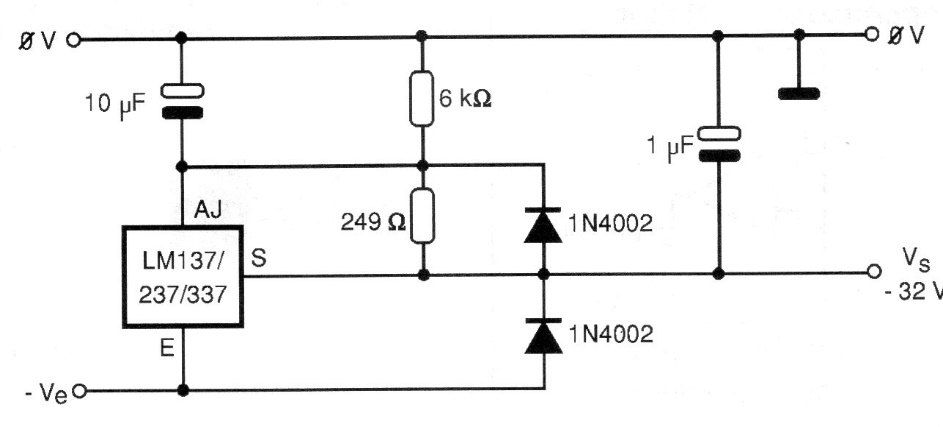 This circuit is the conventional configuration of a negative regulator for a current up to 1 A and voltages up to 32 V. The integrated circuit must be mounted on a heat sink and the output voltage is given by the relationship of values between the resistors in the adjustment terminal.