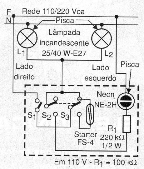 From the STARTER (start switch), used to activate the fluorescent lamp circuit, we can build a simple but efficient light warning system. This circuit makes it possible to establish communication, previously agreed between neighbors, for an emergency or other reason. With it the lamp will blink continuously attracting attention. The STARTER is formed by a neon lamp that, when energized, has its ionized gas, causing it to conduct the current in an alternating way, hence its use to make the L1 and L2 lamps flash. NE-1 monitors the connected alarm circuit. Do not use lamps over 60 W for this type of alarm.