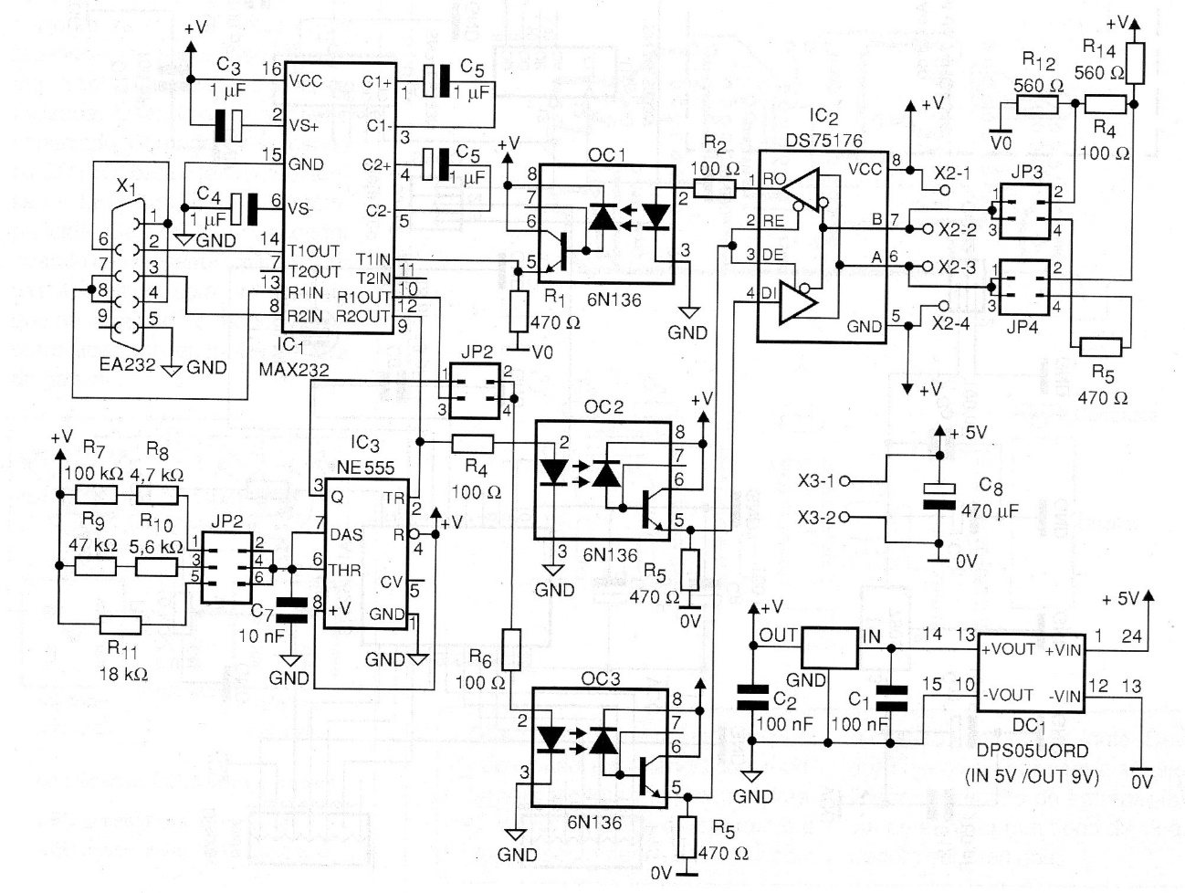 This circuit (2009) has driver control through the RTS signal or in automatic mode through the monostable oscillator at speeds of 9600, 19200 and 56 kbps. Terminal selection active / passive. When receiving data through the EIA232 serial port, it is converted by MAC232 to TTL levels that can be interpreted by the other integrated circuits. The next step is to activate the EIA485 driver (CI 75176), which is done automatically by the timer with the 555 or through the RTS signal from the serial. The 75176 integrated circuit works as a bidirectional converter EIA485 and TTL. For data reception, pins 2 and 3 must be at the low logic level, while for transmission they must remain at the high logic level. When it is not transmitting, the driver must remain configured as a receiver, right after each transmission, pins 2 and 3 return to a low logic level. If any data is received it is immediately converted from EIA585 levels to TTL and then to EIA232 levels.