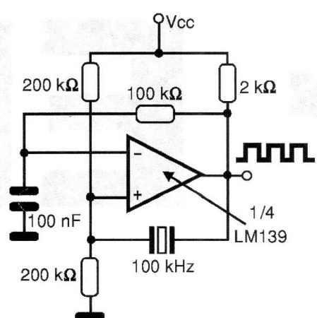 This is one of the possible configurations using the LM139, 239 or 339 voltage comparators. The circuit does not need a symmetrical source and the maximum frequency is around a few megahertz.