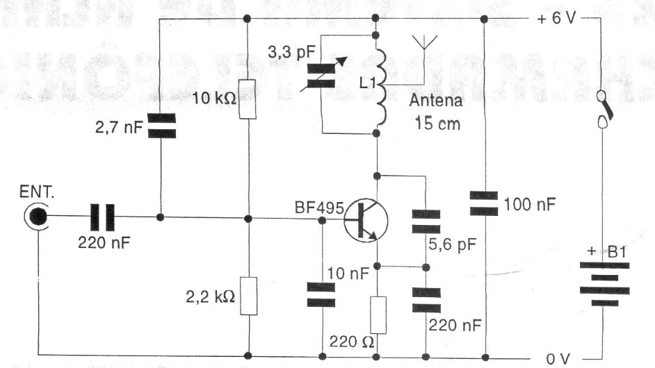 This circuit has a configuration very explored in our projects. The range can exceed 200 meters and the power comes from a 9 V battery. A piezoelectric microphone can be connected to the input. The coil has 4 coils of wire 24 or 26 in a 1 cm diameter coreless form.