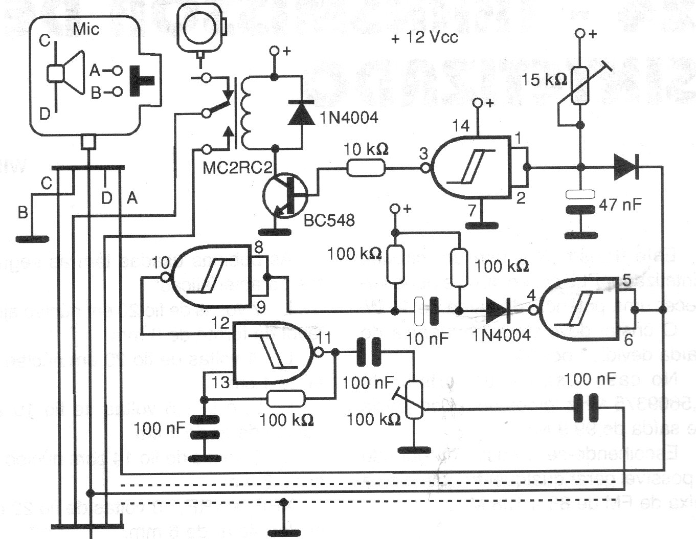 The purpose of this 1999 documentation circuit is to produce a beep when the shift switch is activated. The circuit uses components that are still common and can be adapted to other types of transceivers that do not have this feature. The circuit is powered by 12 V obtained from the transceiver itself.
