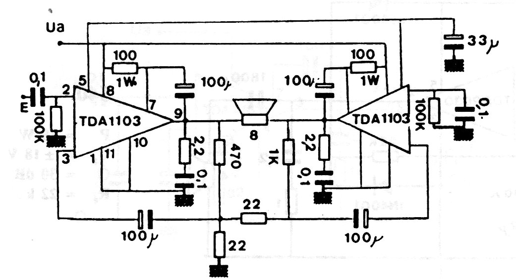This is a Philips commercial circuit from the 1980s. The circuit must be powered by 28 V and its gain is 40dB. The input resistance is 100 k ohms. The integrated circuit must have a good heat sink.
