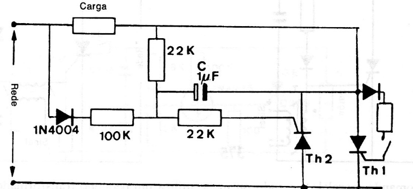 In this circuit we have the way to use a simple switch to control SCRs in a full wave system. The circuit is from a 90s manual and SCRs must be specified to control the chosen load. SCRs must be provided with heatsinks, depending on the controlled load. The worthless resistor has 330 ohms to 1 k depending on the SCR sensitivity.