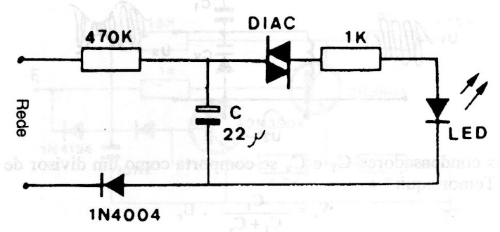 This ultra-low power circuit uses a diac to flash an LED when connected to the power grid. The intensity of the blinks and the frequency are given by the capacitor value that can be changed over a wide range of values.