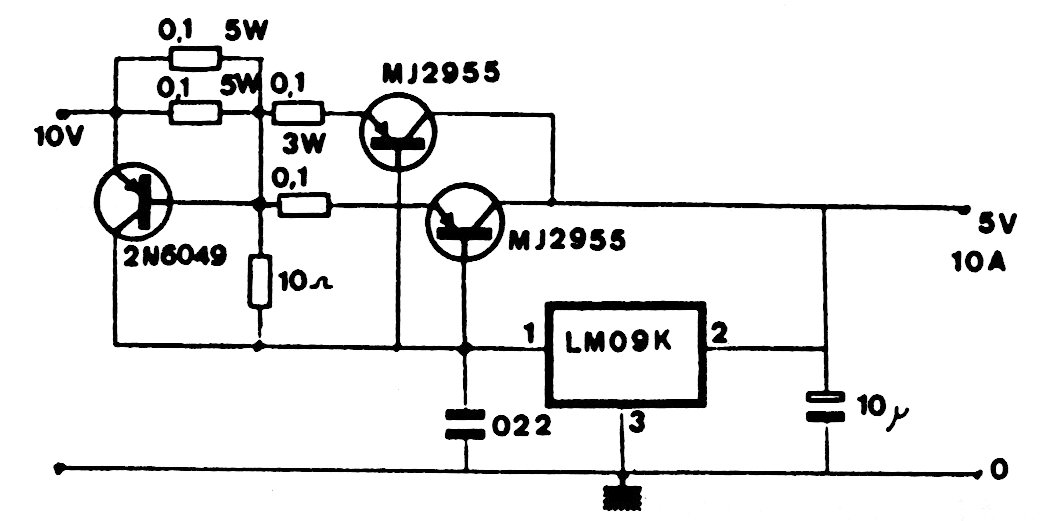 We found this voltage regulator for 5 V with current up to 10 A in an old manual of integrated circuits. The components used are not very common today and the transistors must be mounted on excellent heat sinks.