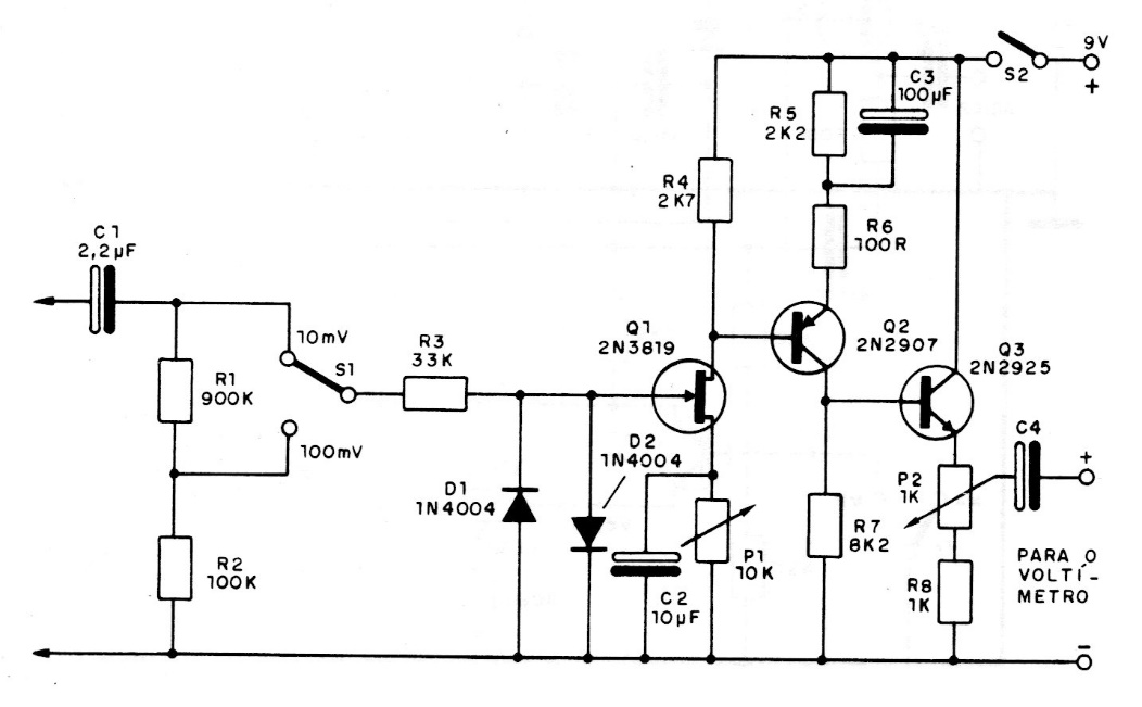 This circuit is connected to the input of a good amplifier serving as a follower of audio signals or audio probe with excellent gain. The circuit has a sensitivity of 10 mV and an input impedance of 1 M ohm. We found the circuit in a technical documentation from the 80s.