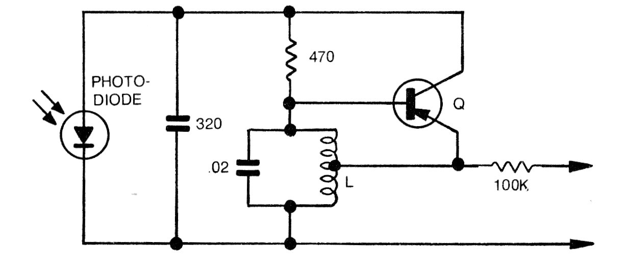 This circuit from an American documentation from the 70s, indicates a photodiode to generate energy from light. Small cells like those used in calculators will provide better results and the frequency depends on the coil and capacitor in parallel with it.