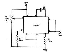 The CMOS 4046 integrated circuit is not very common today, consisting of a very efficient PLL for many low and medium frequency applications. The circuit presented is from a documentation from the 1960s and can generate signals from close to 60 Hz to 1.4 kHz. Another frequency range can be obtained by changing the capacitor.