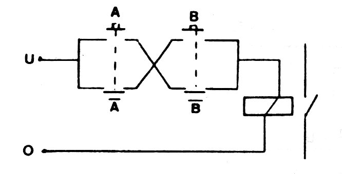 For this function, a little more sophisticated, we need switches (keys) or double sensors. This is necessary, because when a sensor connects in one half the other disconnects. We can use an H switch for this purpose, where the sections will be connected alternately. The circuit of this function implemented with relays is shown in the figure. The truth table for this function IS: