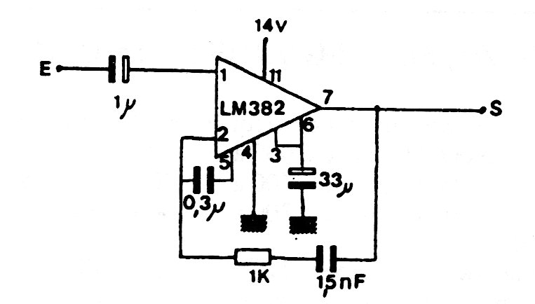 This circuit from the 1980s uses an operational amplifier that is uncommon today. The circuit can be designed with modern operators. The gain is 40 dB.