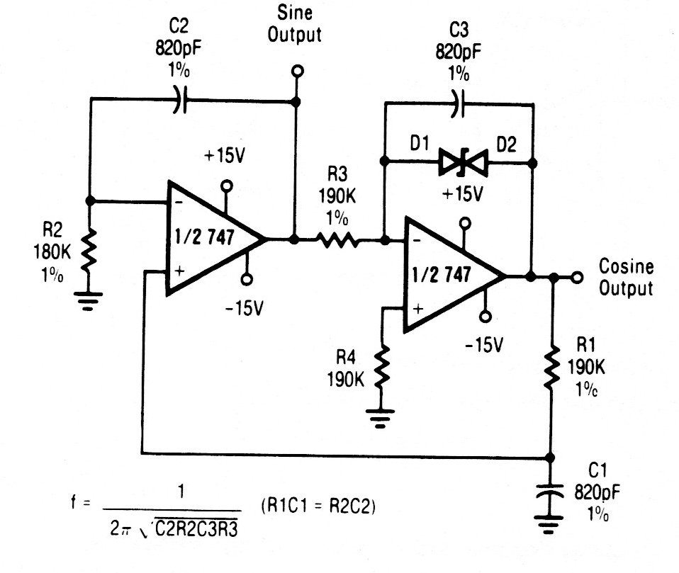 The oscillator shown in the figure has the formulas next to the diagram for calculating the components. The operational used is a predecessor of the 741 and the configuration can be elaborated with more modern operational ones.