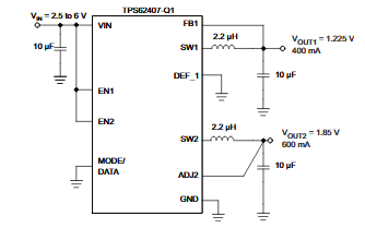This circuit was obtained from the Texas Instruments component datasheet which can supply currents of 1 A (1,225 V and 400 mA (1.85 V). The inputs can be between 2.5 and 6 V. The circuit is step down.