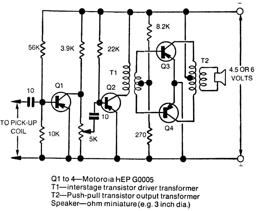 This stage of low power audio amplification was very common in devices powered by the 60's and 70's battery. The circuit is from a publication of the time and the transistors used admit equivalents with eventual changes in the polarization resistors.