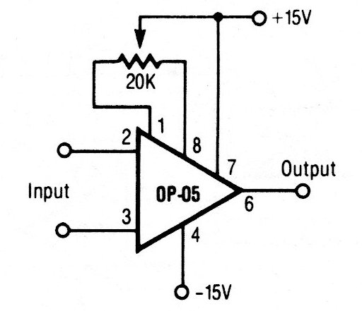 In the figure we have the way to adjust the output null of an operational. The configuration applies to any common operational that has pins for this purpose. In some cases, the potentiometer is connected to the negative of the source.