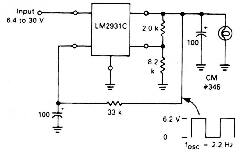 This circuit uses the LM2931 which is not a common component today. What it does is to activate a lamp causing it to blink at a frequency determined by the capacitor.
