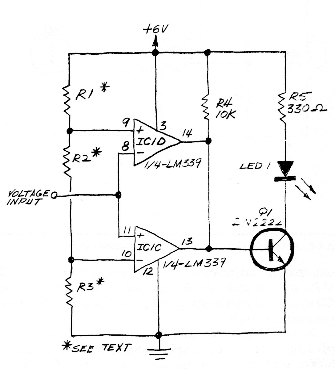 This window comparator or limit comparator has its actuation range determined by resistors R1 to R3 whose typical values can be between 1 and 100 k. The circuit, in this case, triggers an LED, but other loads can be used depending on the application. The supply voltage can be between 5 and 12 V. The circuit is from American documentation from the 90's.