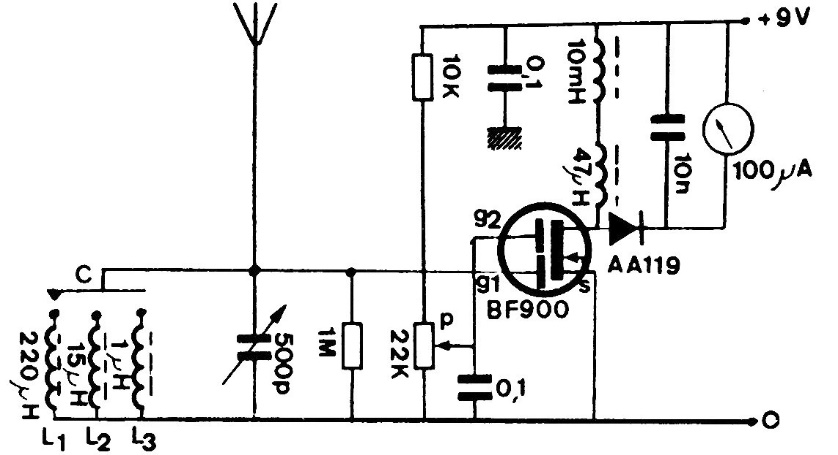 This circuit covers 400 kHz to 40 MHz in three bands according to the selected coil. The double MOSFET allows equivalent, since the original is not easy to obtain.