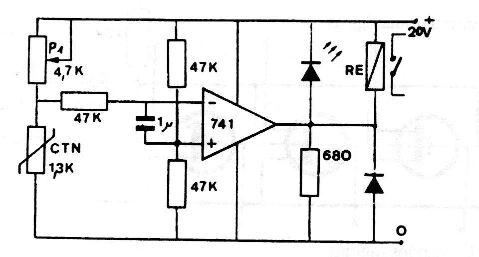 In the figure we have a diagram of a thermostat using an NTC and an operational amplifier 741. The relay used is of the high sensitivity type. For relays that require more than 10 mA, a power step must be used, the trigger point adjustment is made in P1. Voltages according to the relay can be used in the supply.