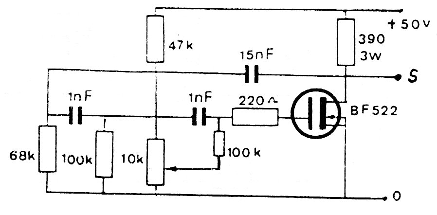 We found this oscillator in a publication from the 1960s. The frequency is around 600 Hz with the components used and any power MOSFET can be used. Observe the high supply voltage. The potentiometer is used to adjust the oscillation point according to the RC phase shift network.