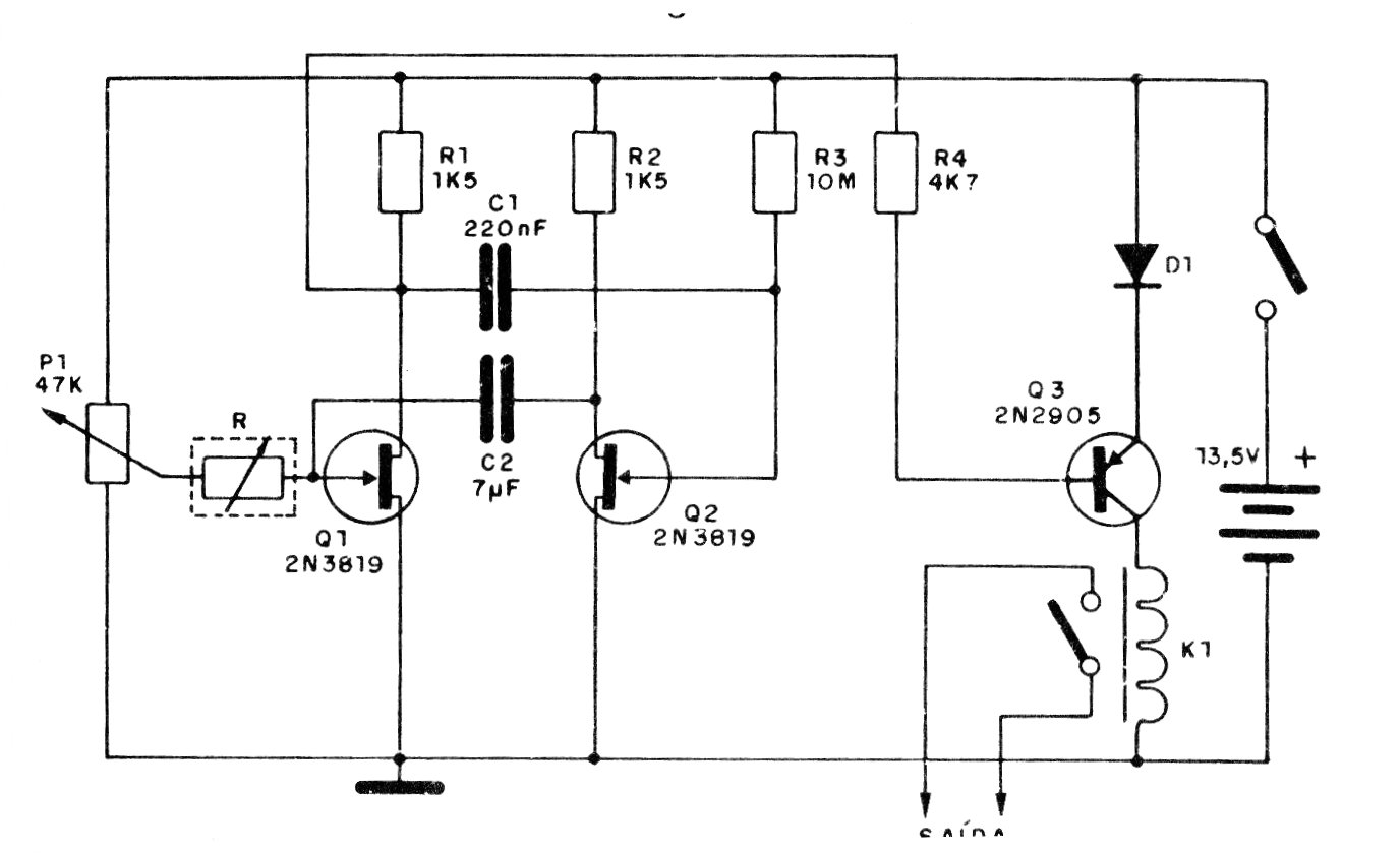 This circuit with JFET was obtained in a book on FETs of 1989. The circuit is still current since equivalent FETs like BF245 can be used. The relay is according to the supply and the capacitor selector network for the times is given next to the diagram.