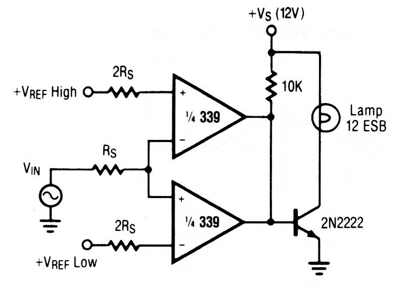 This circuit is valid for other comparators of the same series. In this case, a lamp is excited, but an LED can be used in series with a resistor or other load. The transistor admits equivalent.