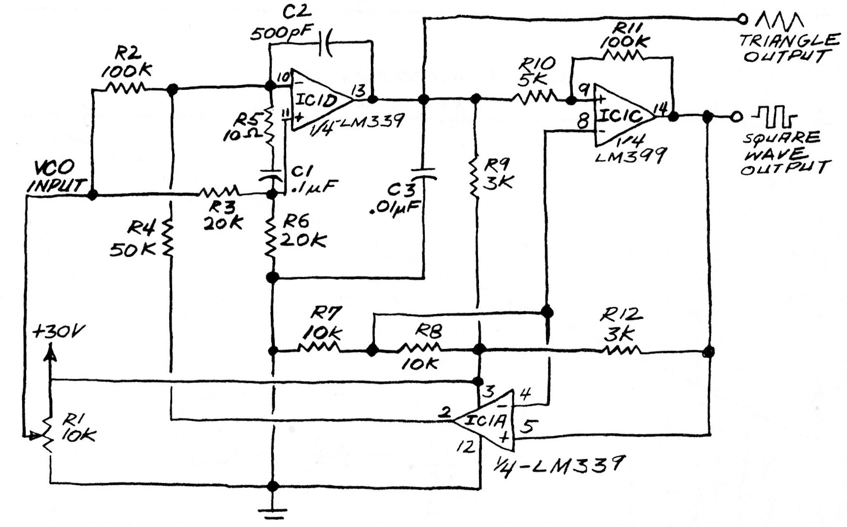 This circuit is based on the voltage comparators contained in the LM339 integrated circuit. The circuit is from a 1991 documentation and must be powered by a simple 30 V source. With the components used, the frequency varies between approximately 5 and 50 kHz.