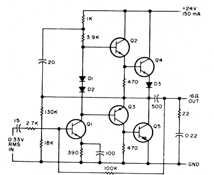 This circuit, from an American documentation from 1975, can be assembled with modern transistors such as the pair BD135 and BD136 at the output and general-purpose transistors such as BC547 and 557 in the other functions. The circuit has excellent sound quality.