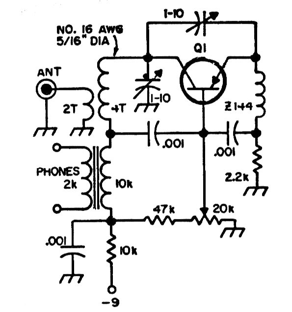 This super regenerative 1-transistor receiver was obtained in an American documentation from the 1980s. The coils can be modified to other frequency ranges and the transistor can be any RF PNP or even NPN if the power is reversed.