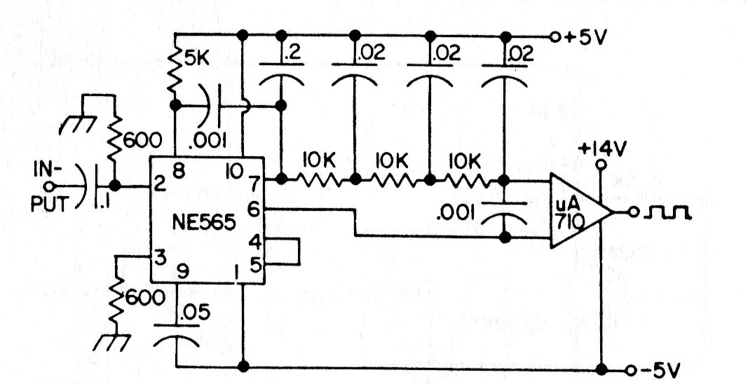 This circuit decodes FSK signals with frequencies of 1070 and 1270 Hz and can be used in data transmission applications by common short-wave transmitters. The circuit is a documentation for radio amateurs of the 70s.